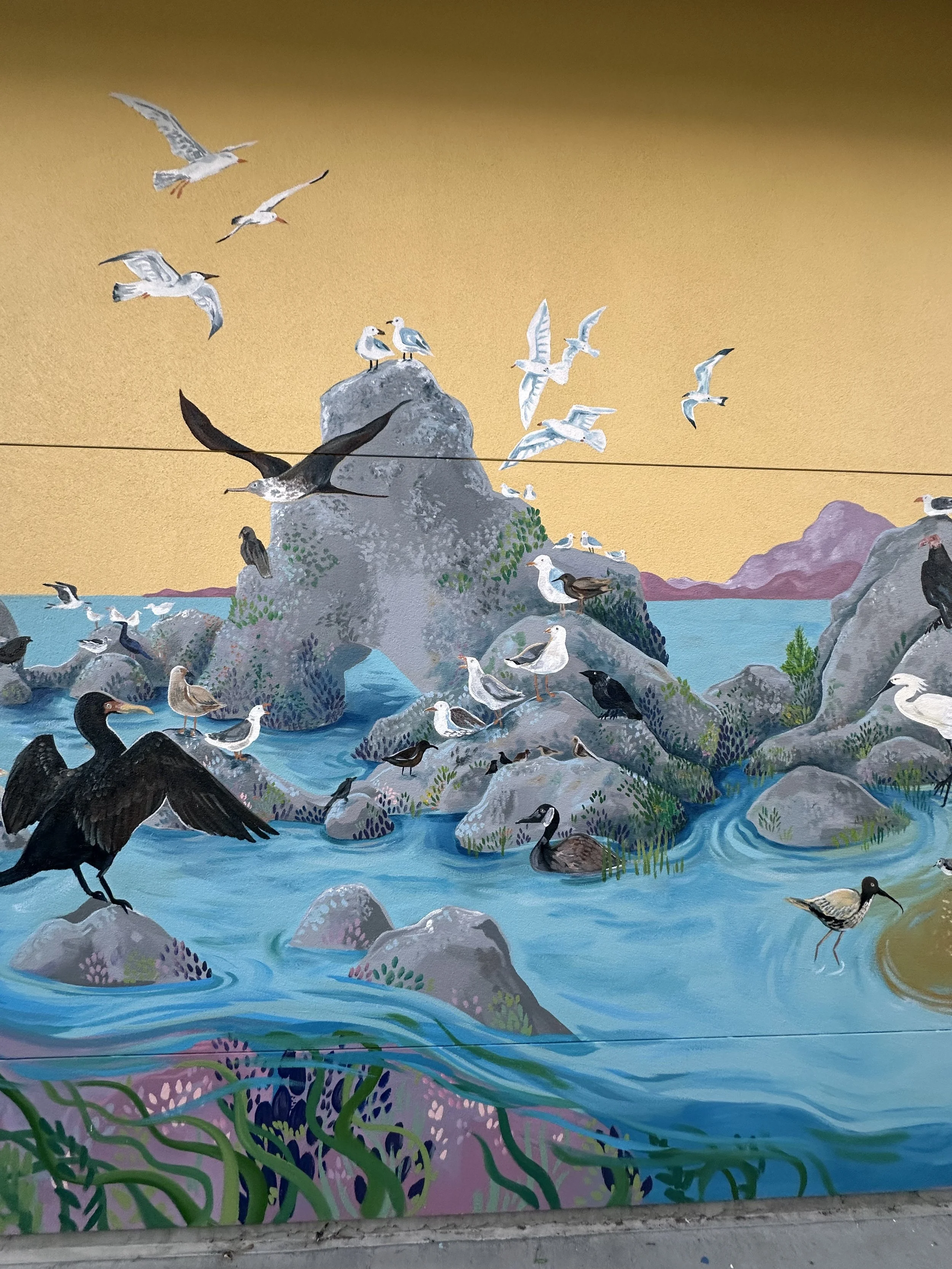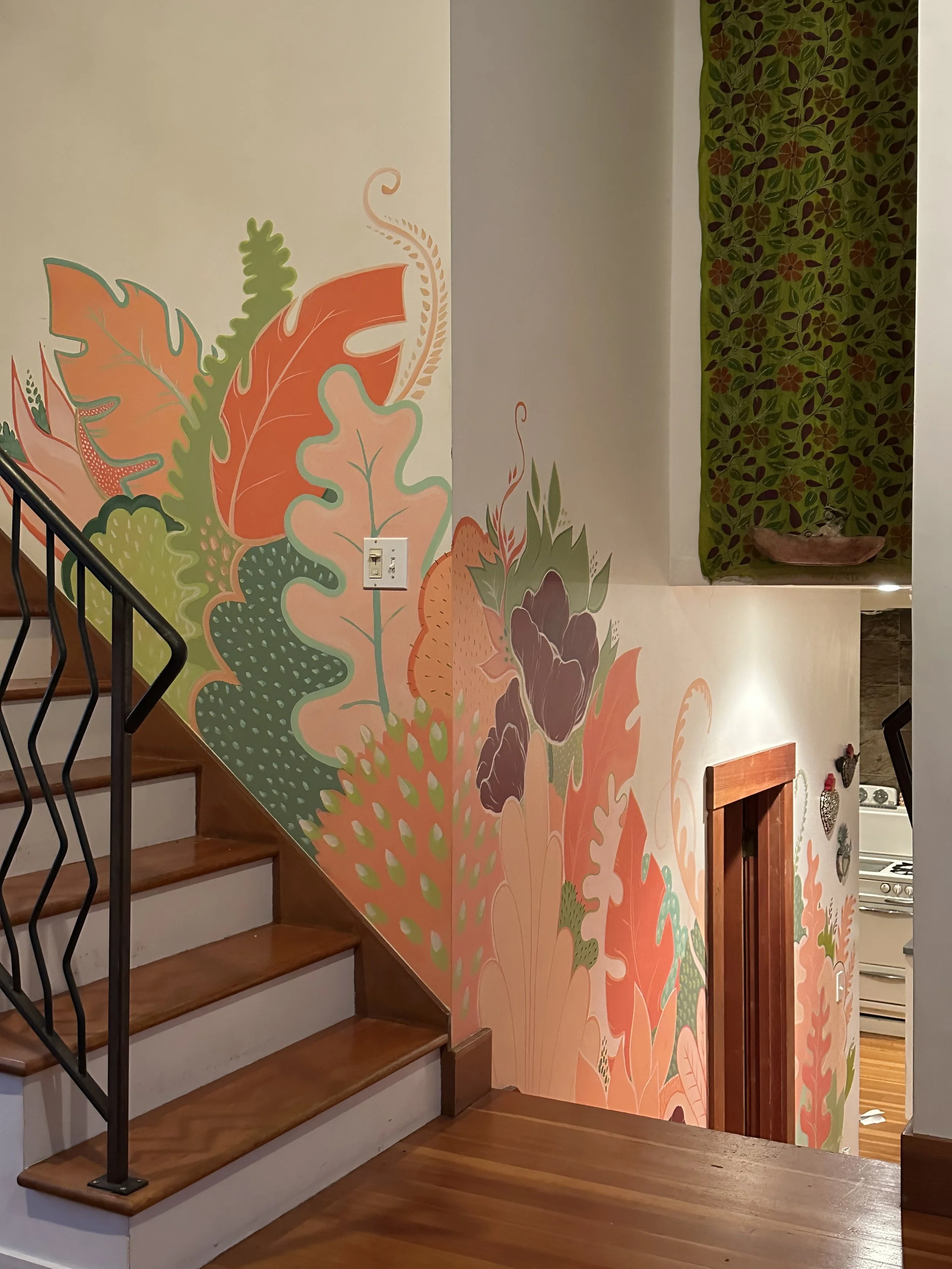 Schools hold a special place in my mural work — I’ve painted four elementary schools and one preschool, turning hallways and playgrounds into colorful, story-filled spaces where imagination can run wild. I love working with bright, bold colors and weaving in whimsical, imagined plants that make each mural feel alive and unique.